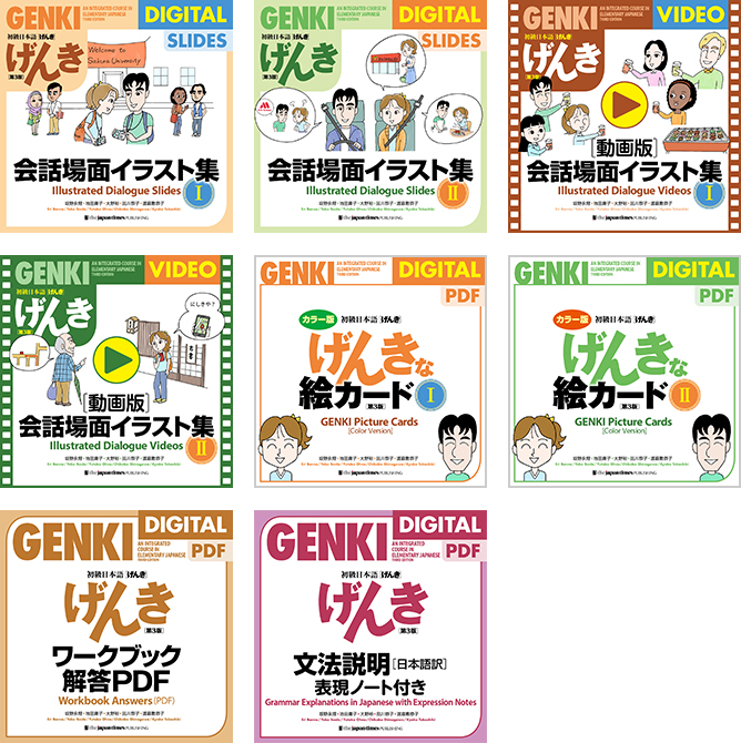 上記の補助教材以外にも、げんき各課の会話の実写ビデオ「げんき会話ビデオ」や文型をスキット動画で導入できる「げんき文型ビデオ集」などが無料でご利用いただけます。詳細は学習者用ページをご確認ください。